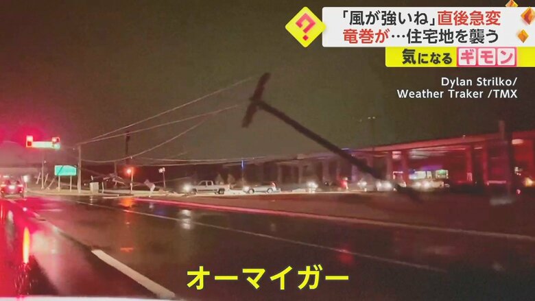 道路には倒れた電柱が延々と続き、撮影者は「オーマイガー」と声をあげた。