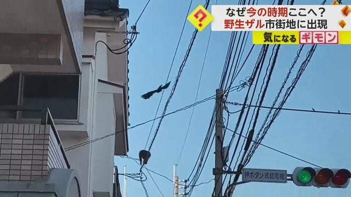 8日午前9時ごろ、鹿児島市の市街地で電線の上を歩く、野生のサル。