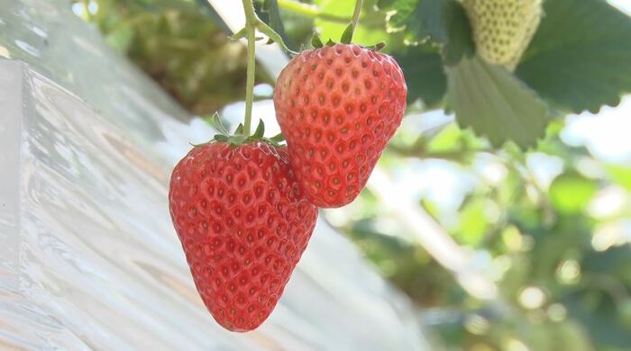 「キャンプストロベリー」を運営する「精農舎」の農園では、冬イチゴの収穫期。「紅ほっぺ」が真っ赤に実っている。