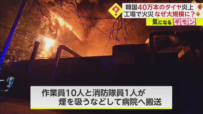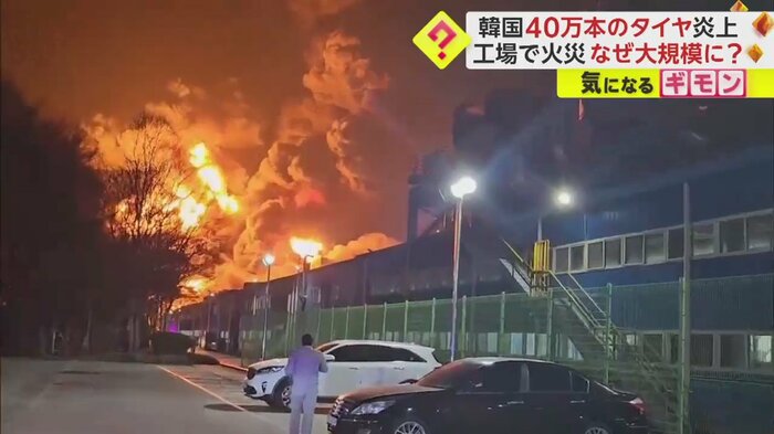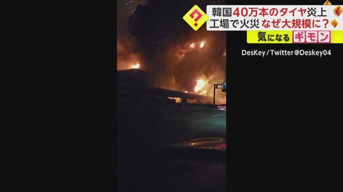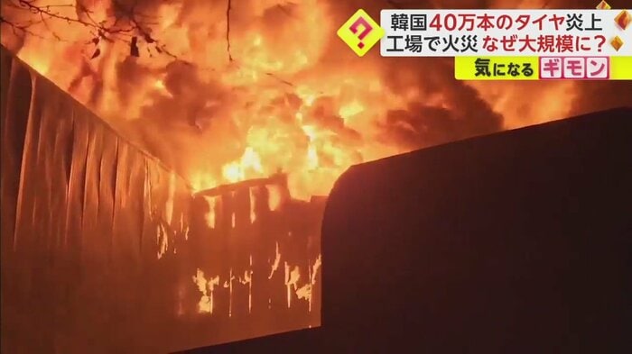 韓国の地元メディアによると、タイヤ40万本を保管していた倉庫1棟が全焼した。