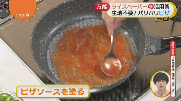 まずは、ライスペーパーをフライパンにしく。その上にピザソースを塗り、ソーセージやベーコンなどを盛り付け、チーズをちらし、とけるまで焼けば…
