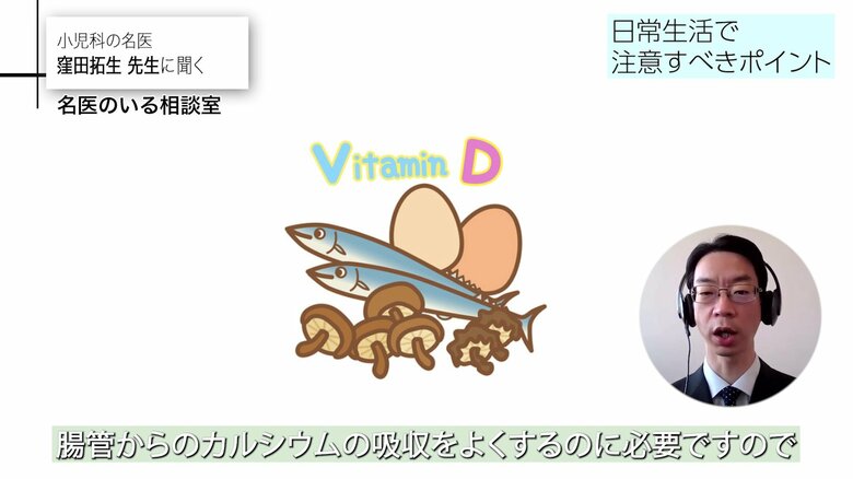 骨形成不全症の患者さんは骨折をしやすいですが、先述の薬による治療をサポートするため、普段の食生活でカルシウムをしっかり取っていただくことや、腸管からのカルシウム吸収を良くするのに必要なビタミンDが欠乏しないよう、適度に日光照射を受けたり、食事をとったりすることも重要です。
