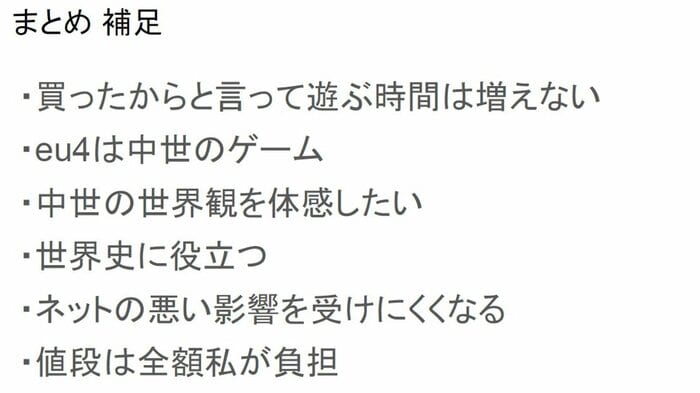 その上で、EU4がなぜ欲しいのか伝えようと、さまざまな国で遊べて国同士の外交が大切なゲームで、苦手な中世の世界史を学ぶことに役立つことや、YouTubeの視聴時間が減るといった購入するメリットをアピールした。