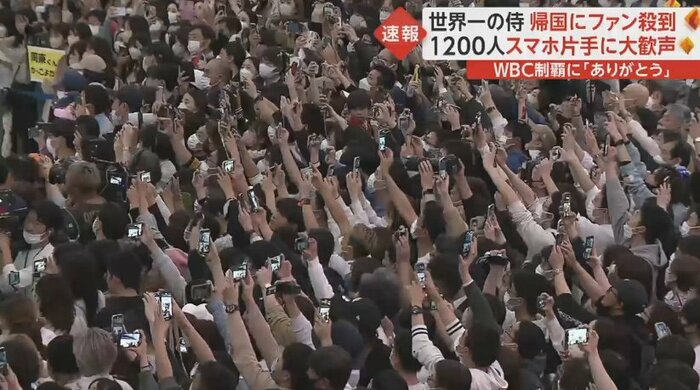 WBCで優勝し世界一となった侍ジャパンの姿を一目見ようと、空港には、侍応援団と、その瞬間を収めようとスマートフォンを掲げている人がたくさん集まった。