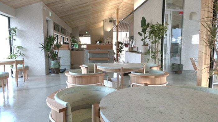 八峰町八森にオープンした「LABO and CAFE YAMAMOTO」。大きな窓から自然の光が入り込み、開放的な空間が広がっている。県内の職人が手がけたインテリアは、秋田杉や十和田石などがぜいたくに使われている。