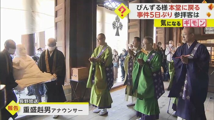 長野市の善光寺から盗まれたびんずる尊者像が5日ぶりに本堂に戻ってきた。