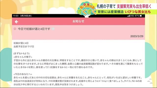 「さっぽろ子育てアプリ」の利用者に配信されるもので、妊娠期から出産100日まで子どもの成長に応じた情報や、札幌市の子育て支援の情報が毎日届けられる。