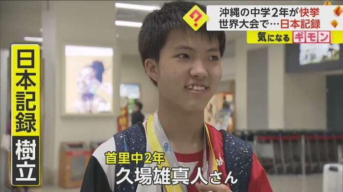 少年は、首里中学2年の久場雄真人さん。日本記録を打ち立てたばかりのスーパー中学生だ。