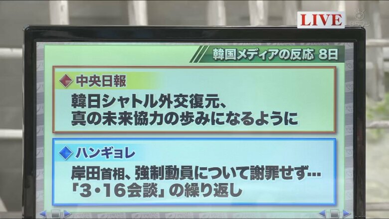 韓国メディアの反応。保守系の中央日報は「韓日シャトル外交復元、真の未来協力の歩みになるように」と歓迎ムード。一方、革新系のハンギョレは「岸田首相、強制動員について謝罪せず…3・16会談の繰り返し」と批判的。