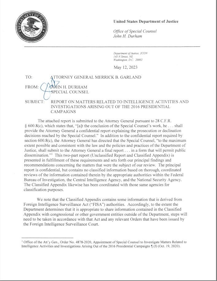 4年前からこの問題を捜査していたジョン・ダーラム特別検察官はこのほど最終報告書をまとめて司法省に提出し、5月15日一般に公表された。