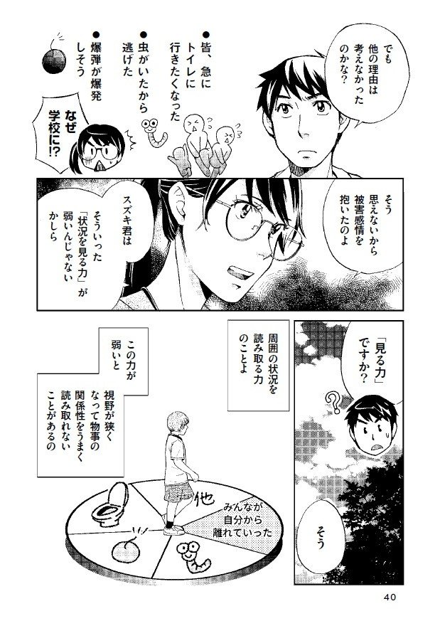 プライムオンライン ライブラリー 暴れる、キレる、被害感情を抱きやすい子どもの背景の一つにグレーゾーンの可能性?大人は子どもが出すサインをキャッチできるか 宮口幸治 2023年6月17日 土曜 午前7:00 マンガでわかる境界知能とグレーゾーンの子どもたち #1 #2 #3 #4 #5 #6 #7 『マンガでわかる 境界知能とグレーゾーンの子どもたち』(扶桑社)宮口幸治著・佐々木昭后作画 宮口幸治 立命館大学教授。(一社)日本COG-TR学会代表理事。京都大学工学部を卒業後、建設コンサルタント会社に勤務。その後、神戸大学医学部を卒業し、児童精神科医として精神科病院や医療少年院、女子少年院などに勤務。医学博士、臨床心理士。2016年より現職。著書に2020年度の新書部門ベストセラーとなった『ケーキの切れない非行少年たち』(新潮新書)などがある 1 2 3 4 マンガでわかる境界知能とグレーゾーンの子どもたち #1 #2 #3 #4 #5 #6 #7 【よく一緒に読まれている記事】 「漢字が苦手…」は子どもが“困っている”サインかも。学習の土台の弱さを大人たちは気づき、救えるか プライムオンライン ライブラリーの他の記事 Do As Infinity、MINMI、とろサーモン、高橋大輔ら登場!「ラブフェス2025」11月1日2日長崎市で開催 グルメや縁日、赤ちゃんも楽しめる!夜は花火も エンタメ 2025年10月30日 移住者が増え続ける島「ないといけないモノってそんなに多くない」10年で88人の若者らが移住 新たな発想で島を盛り上げる ライフ 2025年10月27日 「お前のせいで仕事が進まない」フロア中に響く大声で叱責…「私が悪い」とハラスメント被害を認識できなかった20代会社員の相談 ライフ 2025年10月22日 部下が50代上司の業務指導に「パワハラ」と誹謗中傷。無視や反抗的な態度を取る部下に追い込まれた上司と会社が下した判断 ライフ 2025年10月21日 一覧ページへ