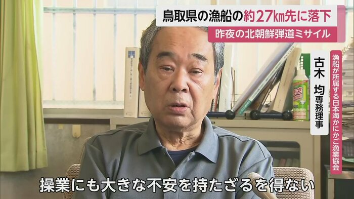漁船が所属する、「日本海かにかご漁業協会」の古木均専務理事は、「花火のような大きな音がした(と聞いた)。非常に腹立たしい。操業にも大きな不安を持たざるを得ない」と話した。