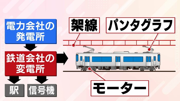 架線とは、列車に電気を供給する電車線のこと。鉄道会社の変電所から列車に架線で電気を送り、列車は車両の上についているパンタグラフで電気を受けてモーターを動かし、列車はレールの上を走る。