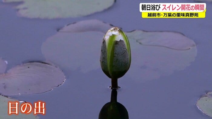 水面に大きな花を咲かせるスイレンが見ごろの時期を迎えた。日の出に咲き、夕方には眠るように花が閉じることから睡眠する蓮(ハス)、睡蓮(スイレン)と呼ばれる。早朝に開花するため、その瞬間はなかなか見ることができない。福井テレビは日の出前から4時間、カメラを回し続けた。