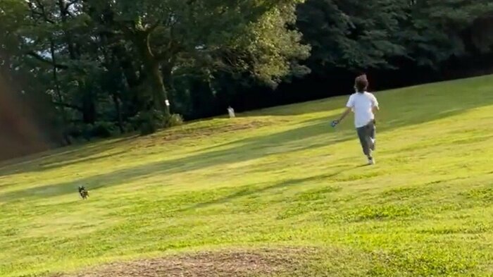 それが、散歩用の「リード」が短いのでは?ということ。遊んでいる時の様子がこちらだ。パパさんがボールを投げると、小太郎くんは爆走!