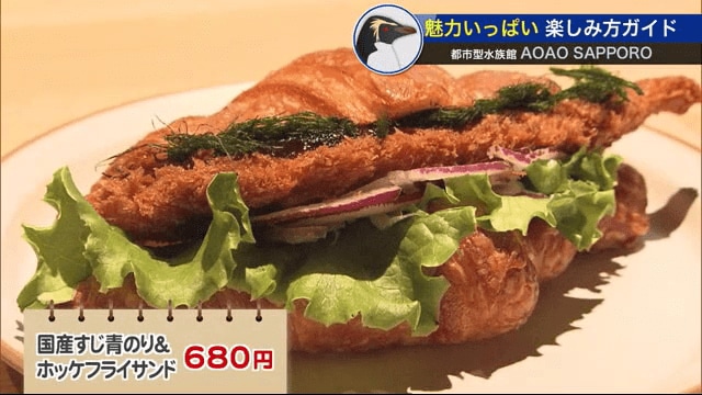 人気のパン店「シロクマベーカリー」が手掛けたパンとお酒が楽しめる「パンバル」だ。限定のメニュー「国産すじ青のり&ホッケフライサンド」や、北海道産小麦を使ったクロワッサンにオリジナルカクテルやビールなども。館内はどのフロアでも飲食可能で、お気に入りの水槽を眺めながら楽しめる。