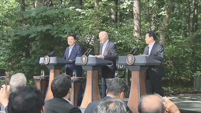 バイデン大統領は今回、ワシントン郊外にある大統領の別荘「キャンプデービッド」に、就任後最初の外国の賓客として岸田首相と尹大統領を招待した。また、国際会議の場以外で3首脳がこの会談のためだけに集まる「単独開催」の初事例となった。国際会議の期間中の3カ国会合はどうしても短時間になりやすく、バイデン大統領は、森林に囲まれた環境下でリラックスした雰囲気で会談しようと日韓首脳を招待したのだ。3首脳はノーネクタイ姿で、バイデン氏は日韓両首脳の肩に腕を回し、3カ国の親密ぶりをアピール。ワーキングランチを含め3首脳は約2時間会談した。