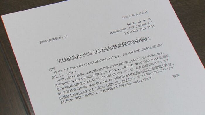 この夏の高温の影響で、新潟県内では9月6日までに24頭の乳牛が死んだ。全体の搾乳量も減少していて、学校給食の牛乳にも影響が出る見込みとなっている。生乳メーカーも売り上げが大幅に落ち込む事態となり、肩を落としていた。