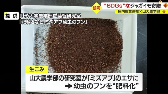 病院で出た生ごみを、山形大学農学部の研究室が昆虫の「ミズアブ」の幼虫にエサとして与え、出したフンを肥料化。その肥料を、庄内農業高校がジャガイモの栽培に活用したという。