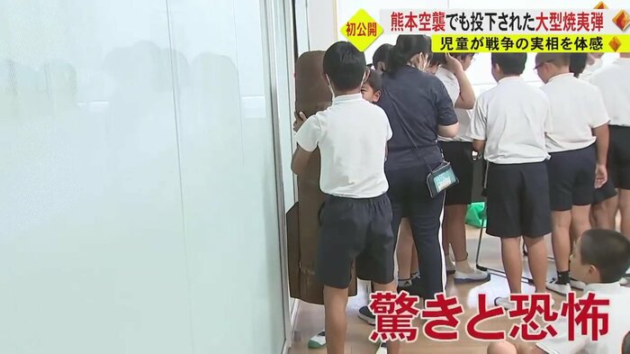 実際に焼夷弾を持ち上げた児童は「中身(爆薬)がないから意外と軽い」と口にしたが、爆薬があったら50kgになることを聞くと「重!重すぎる」と目を見開いた。