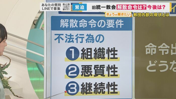 Q.そういう信者へのメッセージもあるのですね、では、今後「解散命令」は出されるのでしょうか。解散命令のポイントをまとめました。まず、解散命令の要件は、不法行為の「組織性」「悪質性」「継続性」となっています。鈴木さんは、このあたりの要件、満たしているとみますか?