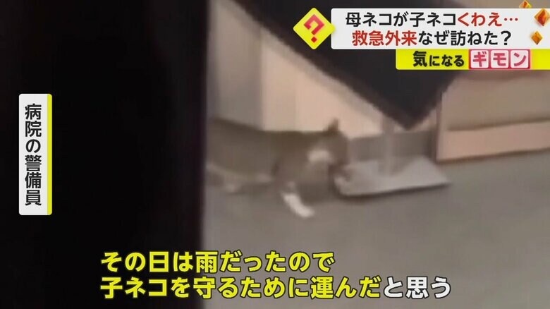 警備員は「母ネコはここ数日、この辺りをうろついていた。その日は雨だったので、子ネコを守るために運んだと思う」と話している。