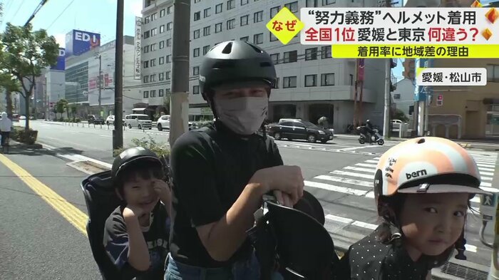 愛媛・松山市では、子ども2人を乗せて走るママさんや高齢の女性もヘルメットをかぶって走っていた。
