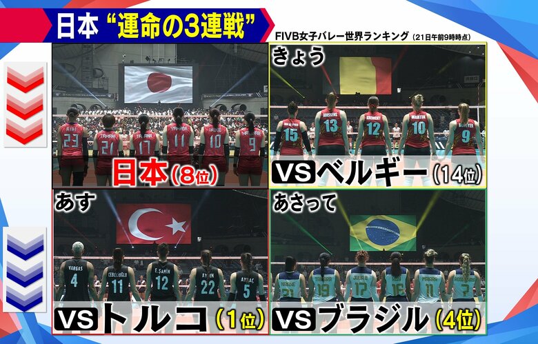 いよいよ正念場を迎えるバレー女子日本代表。世界ランキング8位の日本は、世界ランキング14位のベルギー、1位のトルコ、4位のブラジルとの戦いを控えています。