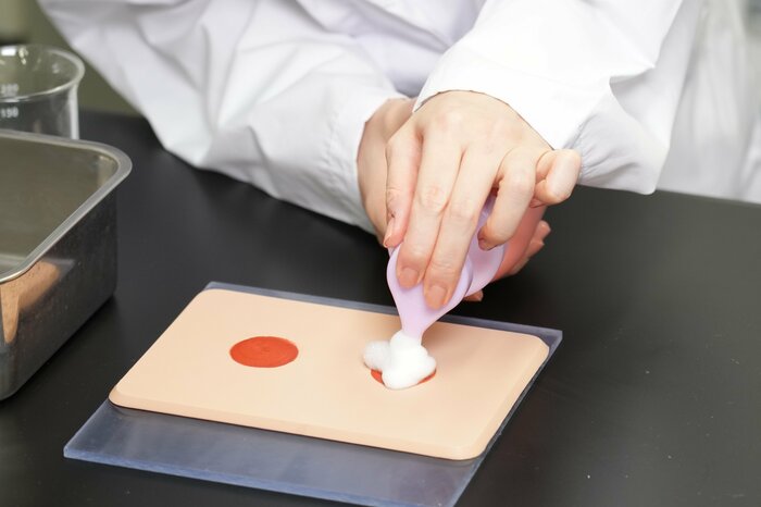 実験では、人工皮膚に赤く着色された皮脂を模したものを塗り、その上に「ミノン全身シャンプー泡タイプ」の泡を適量のせた。