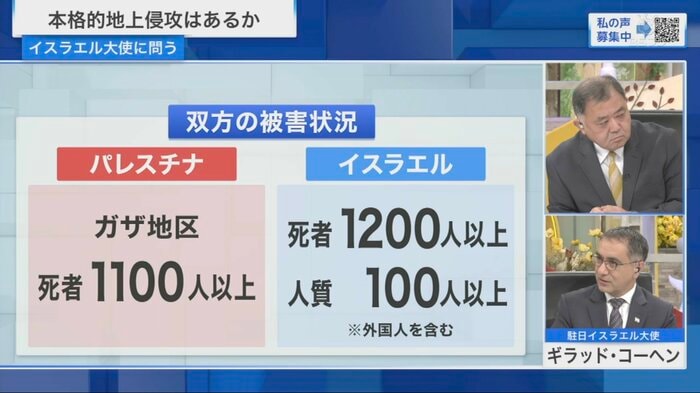 ここからのゲストはコーヘン駐日イスラエル大使。イスラエルのガラント国防相は、「ハマスを地球上から消し去る」と発信するなど地上攻撃を強く示唆したが、大規模な攻撃はいつ行うのか。何をすれば達成されたことになるか。