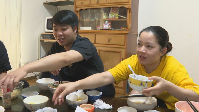 休日のこの日、別の工場で働くベトナムの友人2人を招き、ふるさとの味「フォー」と「春巻き」をふるまった。