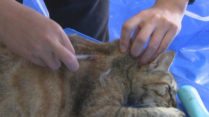 ネコを捕まえて、鎮静剤を注射した上で触診や採血などをする。