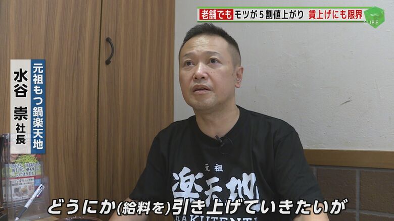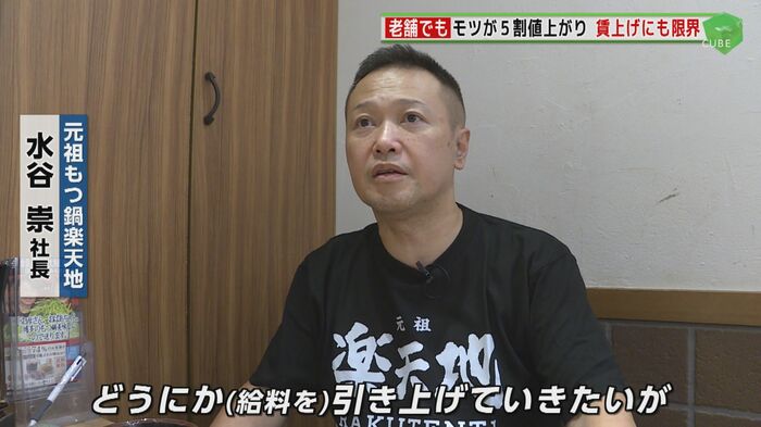 福岡市内で12店舗を展開する老舗のモツ鍋店「元祖もつ鍋楽天地」は、円安もあり、インバウンドの客を中心に店は連日盛況している。10月になって、従業員の給料を時給換算で50円引き上げたが、原材料費が高騰を続ける中、「これが精いっぱい」と話す。