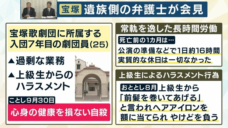 会見を開いたのは、宝塚歌劇団の宙組に所属していた女性(当時25)の遺族の代理人。 劇団員は2023年9月、宝塚市のマンションで死亡しているのが見つかった。遺族は、劇団内の異常なまでの長時間労働と上級生からのパワハラが原因の自殺だったと訴えた。 その長時間労働については…