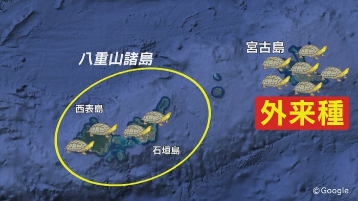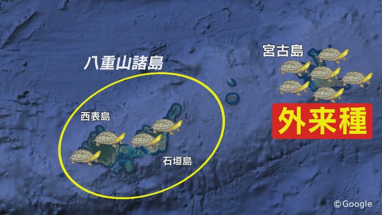 ヤエヤマセマルハコガメは名前の通り、原産は石垣島や西表島がある八重山諸島。石垣島から約133km離れた宮古島にとっては、外から人為的に持ち込まれた「外来種」となる。
