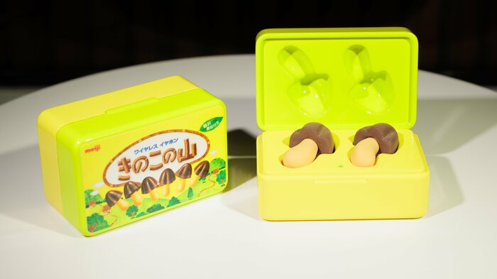 このひとつで「きのこの山のワイヤレスイヤホン」を公開したところ、実現を求める声が相次いだことから、商品化に踏み切ったという。開発中のため、イヤホンのサイズ、価格帯、販売方法などは未定だが、ケースや本体の見た目は「きのこの山」とほぼ同じ。きのこの“かさ”部分にスピーカーがあり、イヤーピースを付けて装着するタイプだ。