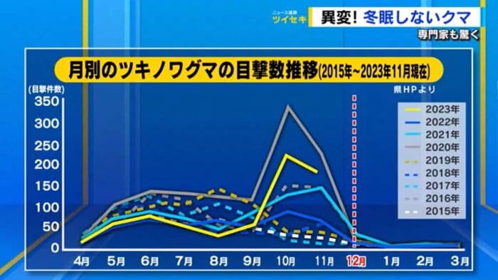 例年12月には冬眠するはずのクマの出没が全国で相次いでいる。この予想外の事態に、専門家も驚いており、2月ごろまで出没が続く可能性もあるという。