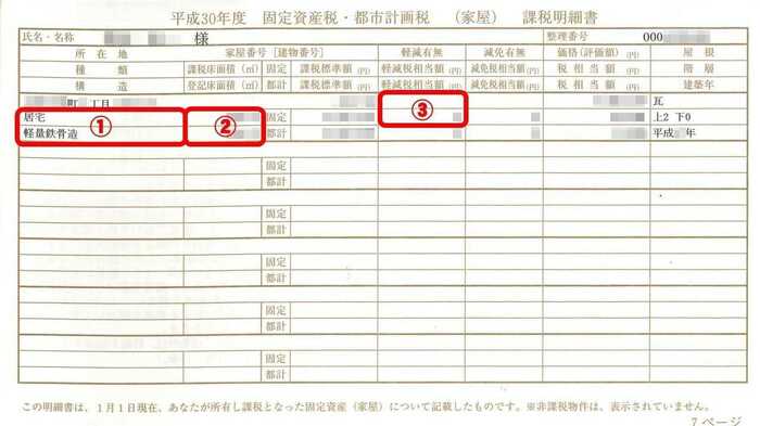 なお、新築住宅では、税額が2分の1になる特例があり、一般住宅の場合は、新築後3年度分、3階建以上のマンション(耐火構造)では5年度分が減税されるが、明細書には、この減税分も記載されている(赤枠3)。
