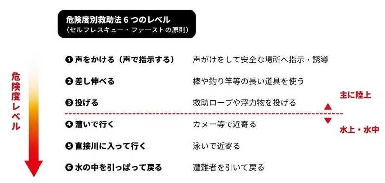 度々ニュースで報じられていますが、川の中に飛び込んで助けに行くのは、危険度レベル最上級の救助法です。自身の身を守るためには救助する側もライフジャケットを着用することが有効です。