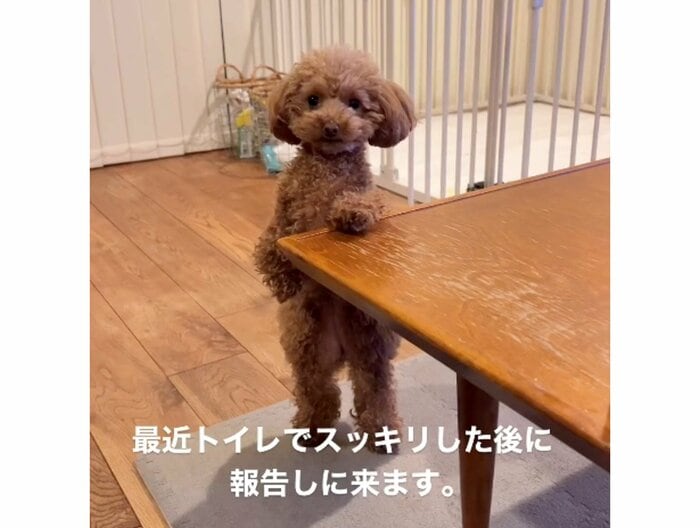 このようなコメントとともに動画を投稿した飼い主(@yukinori_ash)によると、トイレに行ったあとに「トイレへ行ってきたよ!」と報告しに来るという。片方の前足をテーブルに置いて“ドヤ顔”だ。