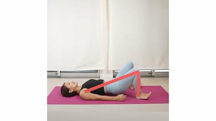 (2)かかとで床を押し、お尻の穴をキュッと縮めながらお尻を持ち上げる。お尻を持ち上げた時、膝の角度が90度くらいになり、膝関節の真下に足首が来るのが良いフォーム。
