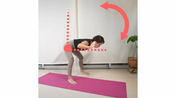 (1)脚を骨盤幅くらいに開いて立ち、膝の力を緩めるように軽く曲げる。股関節から上をまっすぐに保ったまま前傾させる。