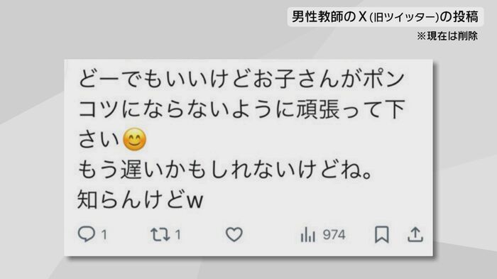大分市の小学校に勤務する30代の男性教師は1月、自身のXで「お子さんがポンコツにならないように頑張って下さい」などと、小学生の娘を持つ愛知県内の40代の女性に対し、中傷を繰り返した。