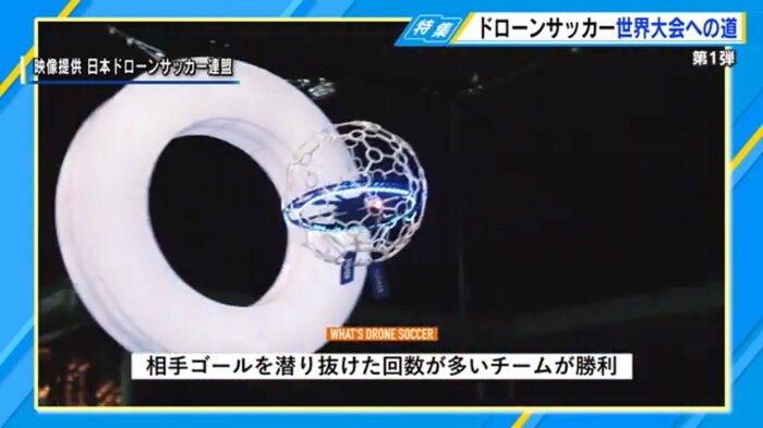 ドローンサッカーは、球状のプラスチックフレームに覆われたドローンボールをドーナツ型の相手ゴールに通過させ得点を競う。