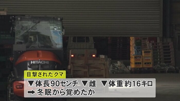 2月、秋田市御所野湯本の物流倉庫でクマ1頭が目撃され、約3日間にわたり倉庫の中にとどまった。このクマは体長90cmの雌で、体重は約16kgと痩せていて「冬眠から目覚めたクマの可能性が高い」とされた。