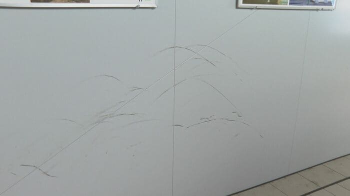 新潟駅の新バスターミナルや駅前広場でみられた傷痕。これらは新潟駅前で禁止されているスケートボードによってつけられたものだ。