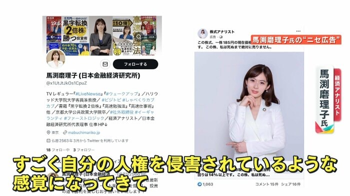 今、増加傾向にあるというSNSで著名人の語る“ニセ広告”。経済アナリストの馬渕磨理子さんもその被害に遭った一人です。