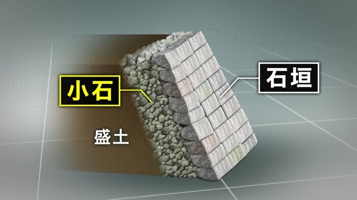 仙台城の石垣の内側は、盛り土との間に小石が積められている。これは江戸時代の工法で、雨水の排水に優れていることに加え、盛り土と石垣の間で緩衝材となり、地震による振動を吸収する役割もしている。江戸時代の耐震対策の一つだ。