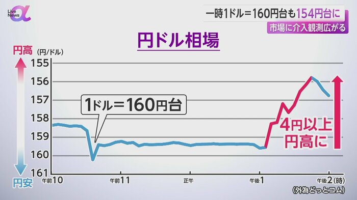 一時1ドル=160円を超えて円安が加速していた円相場は、一転して円高方向に動いた。荒い値動きの中、市場では為替介入の可能性を意識した取引が続いている。