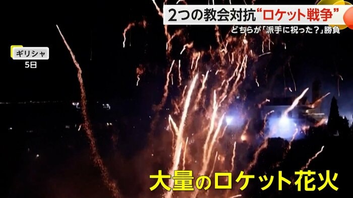 ギリシャ・ヒオス島で5日、キリスト教のイースターを祝う伝統行事が行われた。教会同士が互いの教会へとロケット花火を打ち込むため、別名「ロケット戦争」とも呼ばれている。